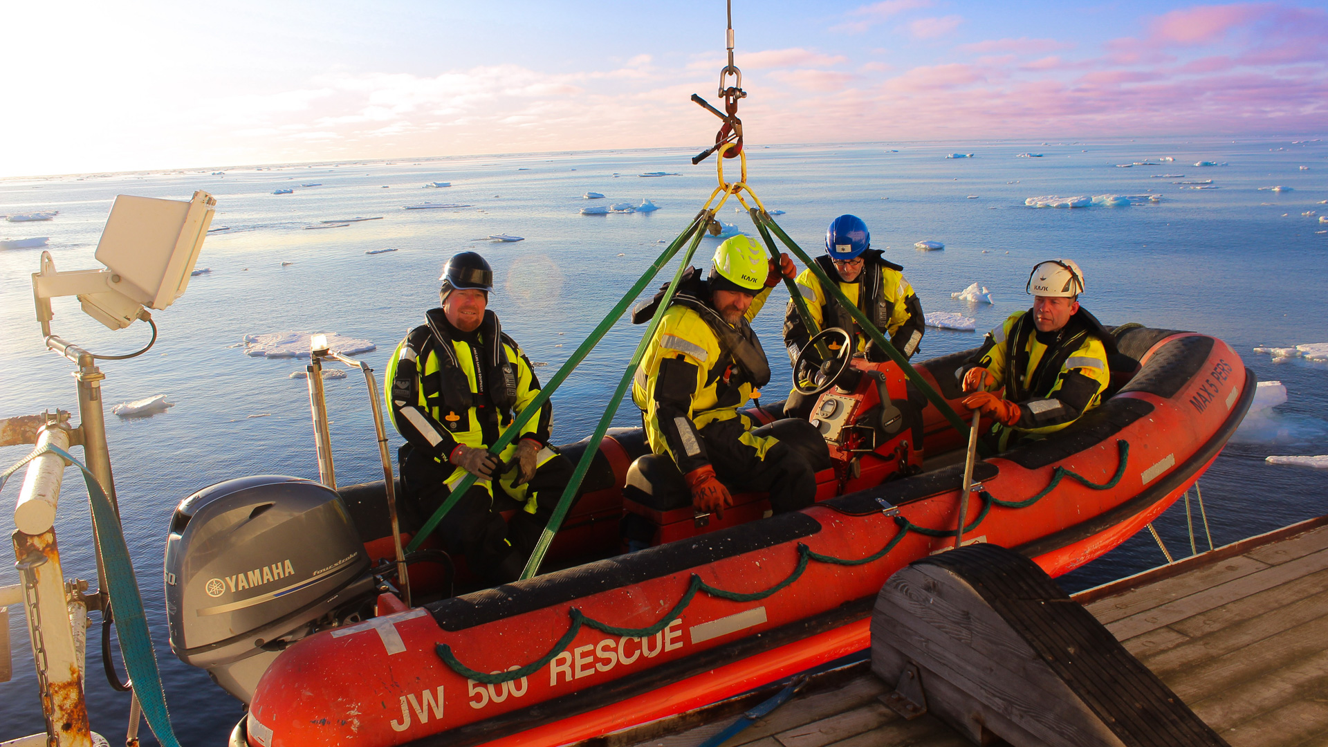 On the morning of the hunt, ice-catching proved easier said than done. Approach, toss, catch, release: So went Jörg’s methodical pattern as the crew navigated with and around the current-carried, wave-washed ice. Once, he nabbed a log-sized chunk but as the others helped tug it back to the ship, a rogue table-sized mass riding a quick current knocked hard against it, fused to its side, and carried it away. Aboard the ship deck, the crowd of scientists oohed and ahhed, clutching fast-chilling cups of coffee.