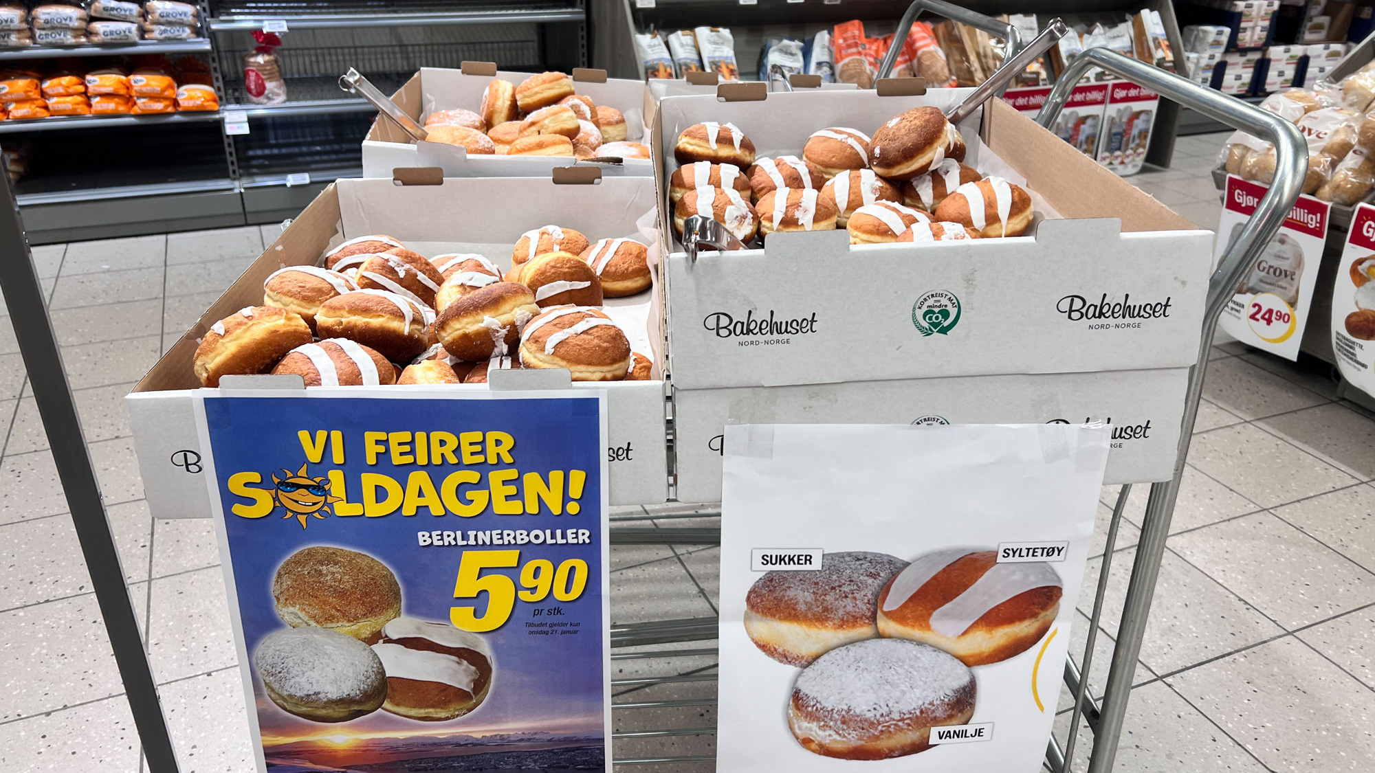 In the north, the day marks a seminal moment. One of my northern Norwegian friends has argued that up here, New Year’s celebrations should be pushed to this day. But it has its own traditions, and of course its own treats. At the local grocery store, a poster depicting a cartoon sun in sunglasses announced the arrival of “Solboller!” (Translated to “sun buns,” it’s a charming rhyme in both languages.) It’s the day, not the recipe, that makes the solbolle; usually, it’s one of two common Norwegian pastries. One is the skolebolle, or “school bun,” a coconut-flaked pastry with a bright yellow custard center. The other is the Berlinerbolle, a filled puffy ball that Americans might call a custard or jelly donut.