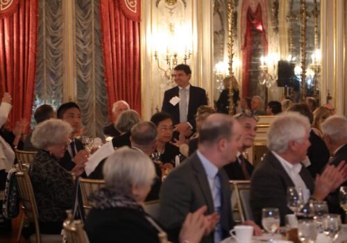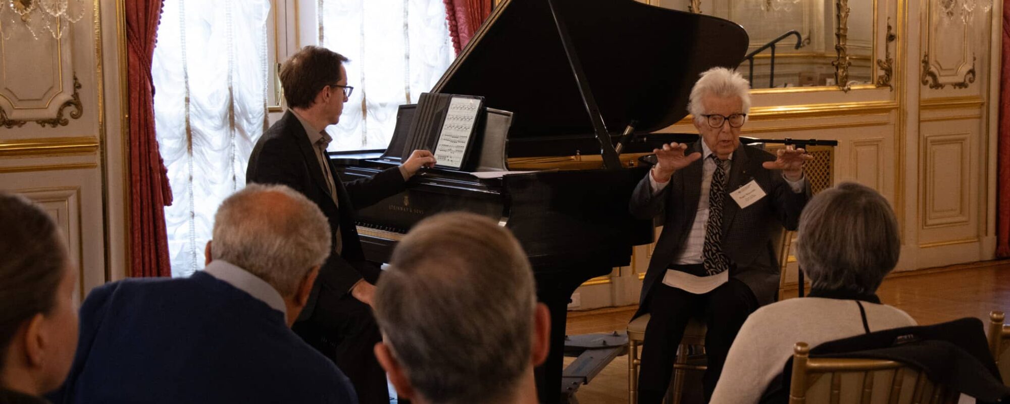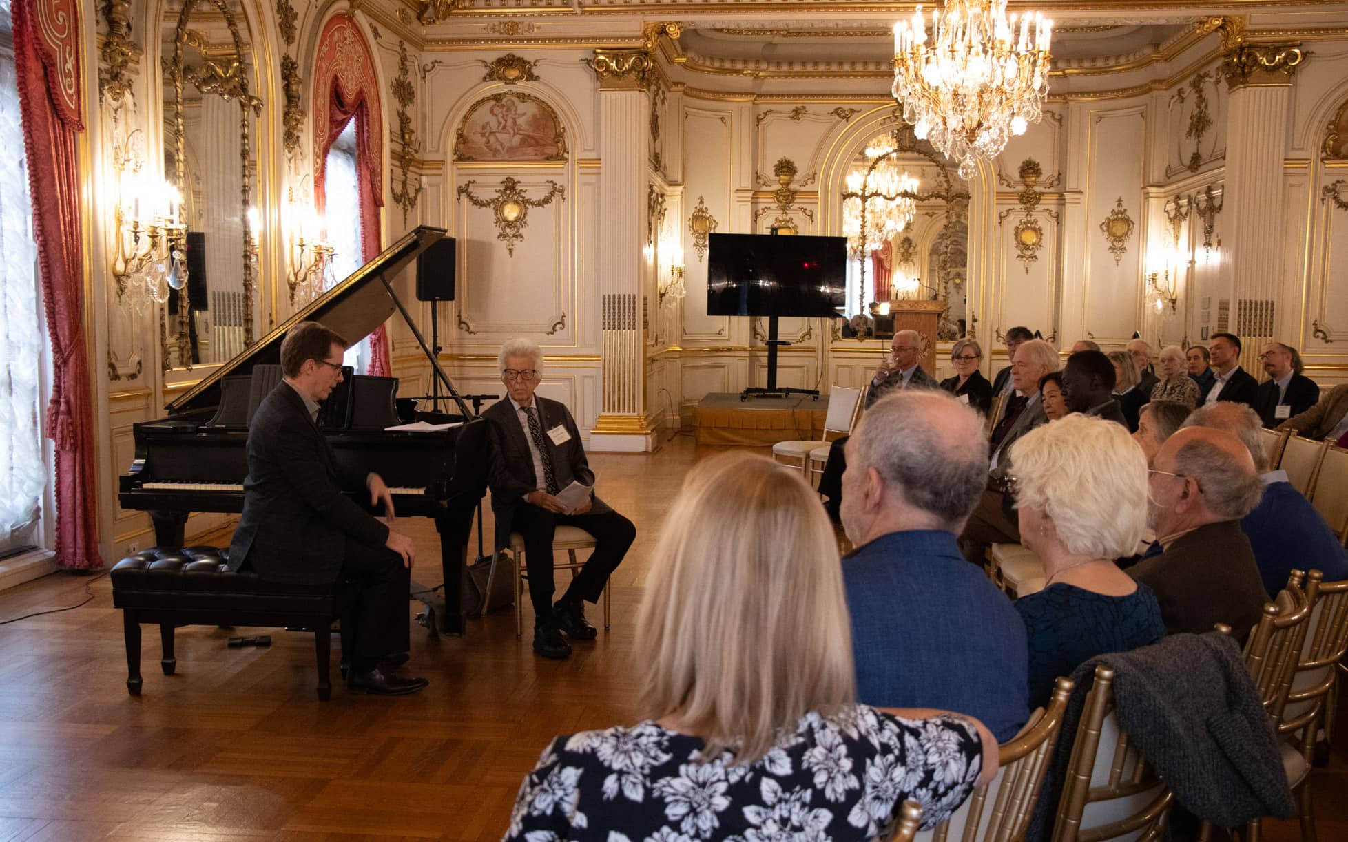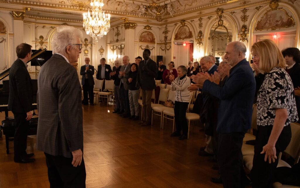 Thundering cascades filled the Cosmos Club’s rococo Warne ballroom together with fragile single notes hanging in the air with inescapable tension when the New York Philharmonic Orchestra pianist Eric Huebner performed former fellow Roger Reynolds’s (Japan, 1966-71) Piano Etude No. 7, Migration during the Institute of Current World Affairs centenary celebration.